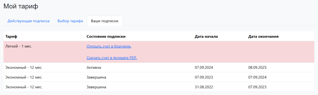 На этой странице список ваших покупок. В открытых тарифах можно скачать счет для оплаты